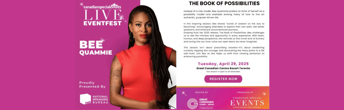 Bee Quammie is a writer, speaker, TV personality, media commentator, and mental health advocate whose work explores untold stories through the lenses of culture, wellness, and identity. She’s the host of kultur’D: The Pop Culture & Diversity Show on Global News Radio and the award-winning creator behind the long-running blog ’83 To Infinity. In 2025, Bee introduces her newest work, The Book of Possibilities—a deeply personal and inspiring look at how asking the right questions can unlock new paths forward. Written during a time when she couldn’t see her own way, Bee offers a powerful reminder of what becomes possible when we pause, reflect, and imagine more for ourselves. With writing featured in publications like Chatelaine, EBONY, VICE, and The Globe & Mail, and speaking engagements across North America, Bee uses every platform to empower audiences with wisdom, warmth, and a message of possibility.